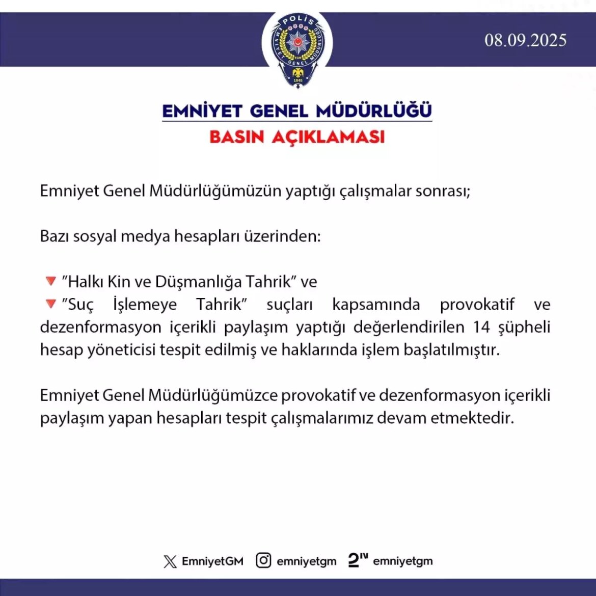 Emniyet Genel Müdürlüğü tarafından, provokatif ve dezenformasyon içerikli paylaşım yaptığı bedellendirilen 14 kuşkulu hesap yöneticisi hakkında süreç başlatıldığı açıklandı.