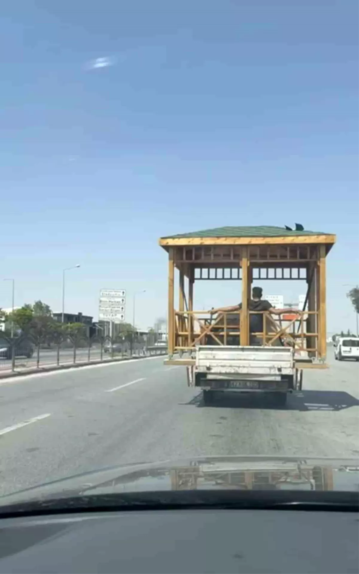 Ankara Caddesi’nde seyir halinde olan bir kamyonetin kasasında trafik kuralları hiçe sayılarak taşınan kamelya, bir vatandaşın cep telefonu kamerasına yansıdı. Trafikte ilerleyen kamyonetin kasasında bulunan kamelyada oturan vatandaşın parkta üzere rahat bir formda oturduğu dikkatlerden kaçmadı. Kamyonetin kasasındaki kamelyada oturan vatandaşı görenler ise ‘kamyonet kasasında kamelya keyfi’ yorumunda bulundu. – KONYA